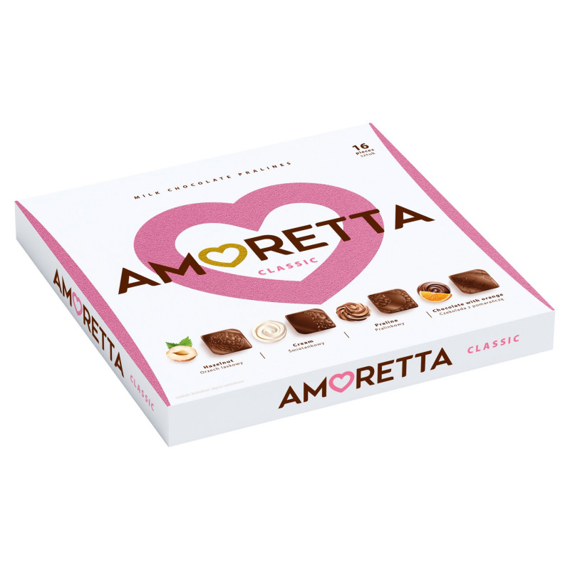 Praliny w czekoladzie mlecznej w czterech smakach: orzecha laskowego, śmietanki, czekolady z pomarańczą i pralinkowym.