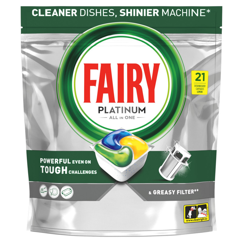 Kapsułki do zmywarki All In One Fairy Platinum działają już przy 1. myciu i usuwają nawet trudne zabrudzenia, pozostawiając naczynia czyste i lśniące. Dzięki mocy czyszczenia kapsułek do zmywarki Fairy Platinum możesz bez obaw przygotowywać wszelkie posiłki, wiedząc, że poradzą sobie nawet z tłustym filtrem, a naczynia i zmywarka będą czyste i pachnące świeżością. Kapsułki do zmywarki Fairy to połączenie płynu i proszku w jednej wydajnej kapsułce. Nasze kapsułki rozpuszczają się niezwykle szybko, dzięki czemu od razu zaczynają działać. A ich użycie jest bardzo proste. Nie musisz ich rozpakowywać. Wystarczy umieścić je w dozowniku detergentu zmywarki do naczyń.