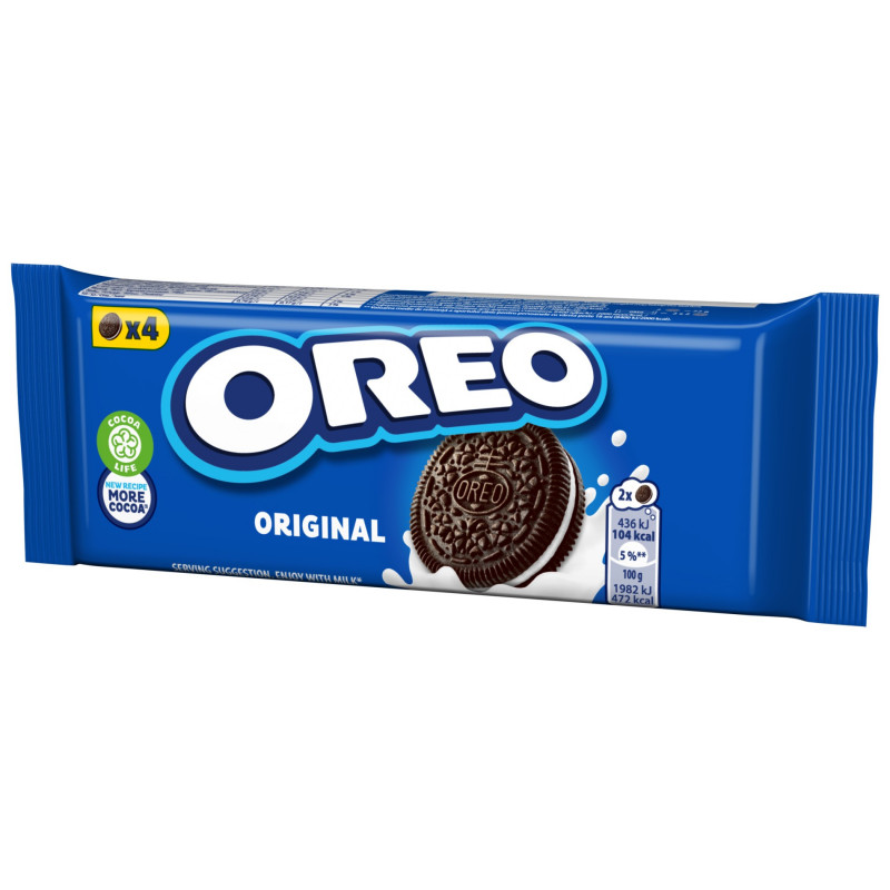 Ciasteczka Oreo Original to intensywnie kakaowe słodkie przekąski, które doskonale współgrają z aksamitnym nadzieniem o waniliowym smaku. Do produkcji ciasteczek Oreo wykorzystano kakao produkowane ze starannie wyselekcjonowanych ziaren, które nadaje im intensywny smak. Jedzenie ciasteczek Oreo to chwila czystej przyjemności, idealna zarówno w samotności, jak i w towarzystwie bliskich. Oreo doskonale smakuje solo, ale świetnie sprawdza się również jako dodatek do lodów, serników czy innych deserów. Zanurzanie ciastek Oreo w mleku to nie tylko smakowita przyjemność, ale także świetna zabawa dla osób w każdym wieku. Dostępne w zbiorczym kartonowym opakowaniu, zawierającym 32 opakowania ciasteczek Oreo Original.