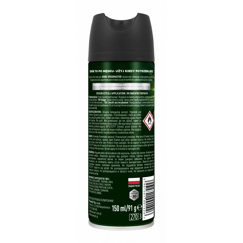Dezodorant Bond dla Panów o klasycznym, świeżym zapachu, łączącym nuty drzewno-morskie, zapewnia długotrwałe uczucie komfortu. Zawiera wielofunkcyjny, nowoczesny składnik dezodorujący, redukujący zapach potu.