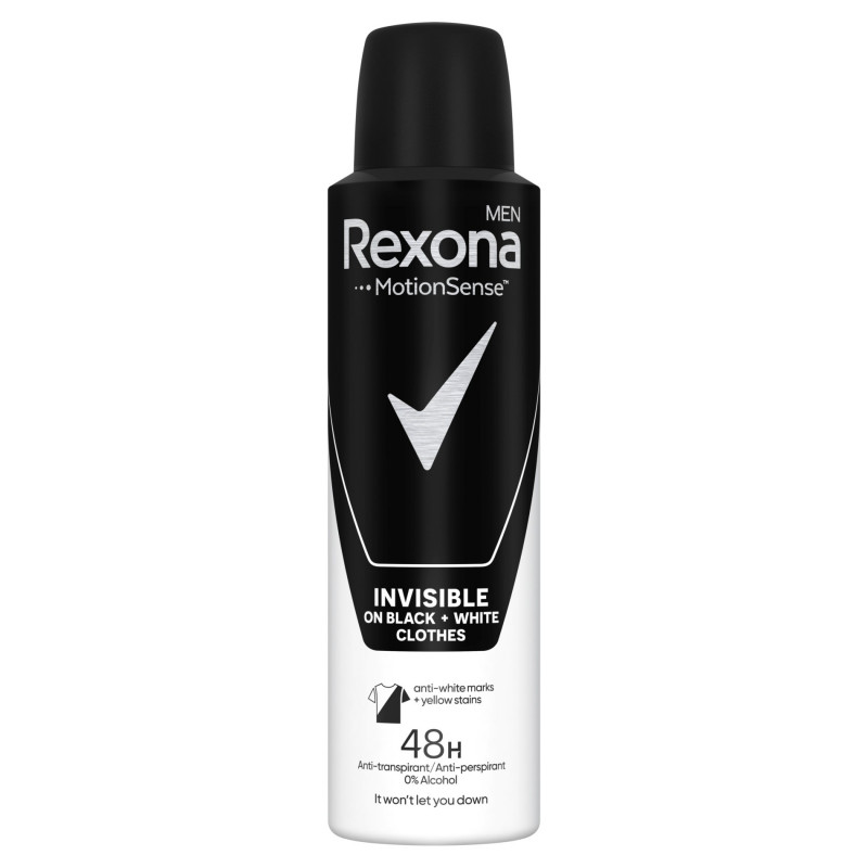 Dezodorant Rexona Men Invisible zwiastuje także koniec walki z nieestetycznymi plamami powstającymi po użyciu antyperspirantu na białych i czarnych ubraniach. Twoja biała koszula pozostanie biała, a ulubiony czarny T-shirt nadal będzie zwracał uwagę swoim głębokim kolorem.