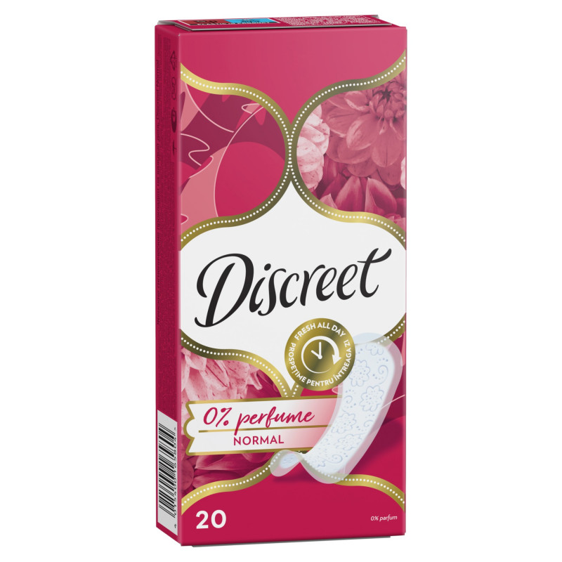 Bezzapachowe wkładki Discreet Normal pomogą Ci czuć się świeżo i pięknie przez cały dzień. Zapewniają pełną ochronę i zabezpieczają bieliznę przed zabrudzeniem. Budowa tej wkładki higienicznej pozwala skórze miejsc intymnych swobodnie oddychać, co zapewnia Ci uczucie świeżości i komfortu aż do 12 godzin. Są tak cienkie, że nawet ich nie poczujesz. Wariant 0% jest całkowicie bezzapachowy. Bez względu na to, co przyniesie Ci dzień, te wkładki sprawią, że wszystko się uda!