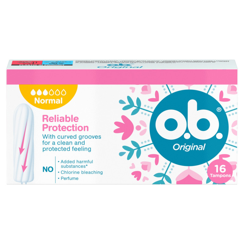 o.b. Original ze skręconymi rowkami zapewnia niezawodną ochronę i uczucie czystości. Bez dodatku niekorzystnych substancji*, chloru, substancji zapachowych.