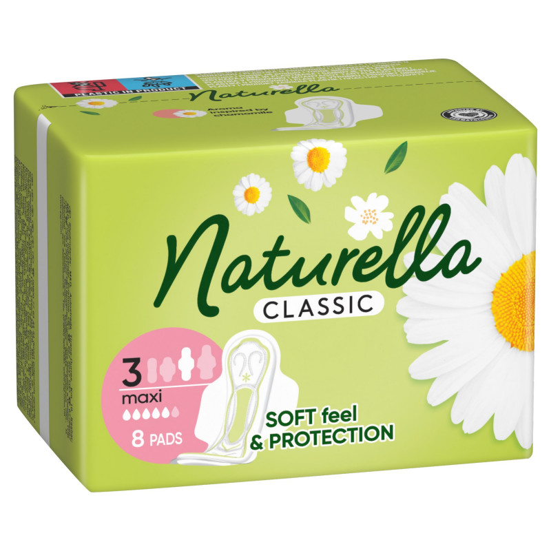 Podpaski Naturella Maxi o delikatnym rumiankowym zapachu zapewniają uczucie świeżości