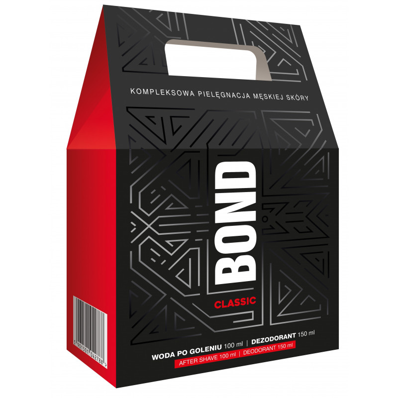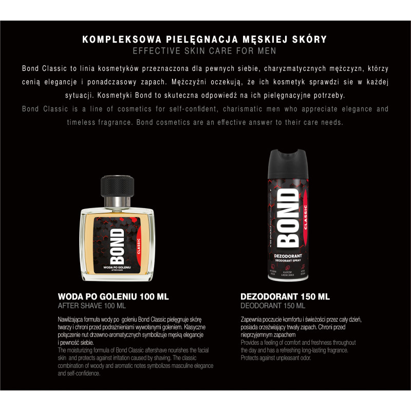 Woda po goleniu 100mlNawilżająca formuła wody po goleniu Bond Classic pielęgnuje skórę twarzy i chroni przed podrażnieniami wywołanymi codziennym goleniem. Klasyczne połączenie nut drzewno-aromatycznych symbolizuje męską elegancję i pewność siebie.Dezodorant 150mlDezodorant do ciała dla mężczyzn Bond Classic skutecznie eliminuje nieprzyjemny zapach potu. Klasyczna, męska drzewno – aromatyczna nuta zapachowa pozostawia uczucie komfortu i odświeżenia przez cały dzień.