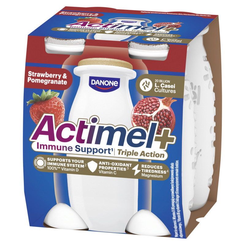 Poznaj Actimel+ Triple Action o smaku truskawki i granatu, czyli nowy wariant znanego, lubianego napoju jogurtowego! Wzbogaciliśmy go o jeszcze większą ilość witaminy D dla zdrowia kości i wsparcia układu odpornościowego. Witamina D pomaga w prawidłowym funkcjonowaniu układu odpornościowego i w utrzymaniu zdrowych kości. Dodatkowo w składzie znajdziesz witaminę C, która pomaga chronić komórki przed stresem oksydacyjnym, a także magnez, który przyczynia się do zmniejszenia uczucia zmęczenia i znużenia. Wszystko po to, aby wesprzeć prawidłowe funkcjonowanie organizmu. Zacznij dzień od smakowitego Actimela+, z witaminą C, B6 i D oraz magnezem a także miliardami kultur bakterii L. casei Danone. Zadbaj przede wszystkim o zróżnicowaną, zbilansowaną dietę oraz zdrowy styl życia.