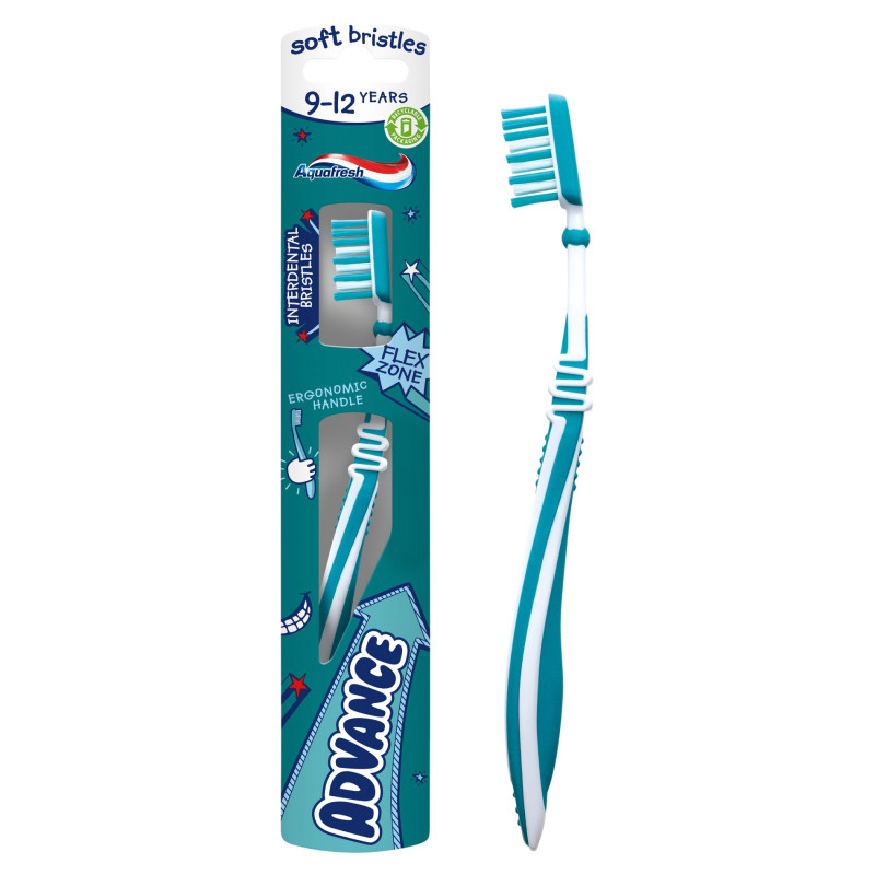 Nasza szczoteczka Aquafresh Advance została zaprojektowana przez ekspertów ochrony zdrowia specjalnie dla dzieci w wieku 9-12 lat. Posiada miękkie włókna o różnej długości, które pomagają w czyszczeniu zarówno zębów mlecznych, jak i nowych zębów stałych, a także w delikatnym usuwaniu płytki bakteryjnej. 6 funkcji kluczowych dla dzieci w wieku 9-12 lat: mała główka, miękkie włókna, różna długość włókien, elastyczna rączka, ergonomiczny uchwyt i atrakcyjny wygląd.