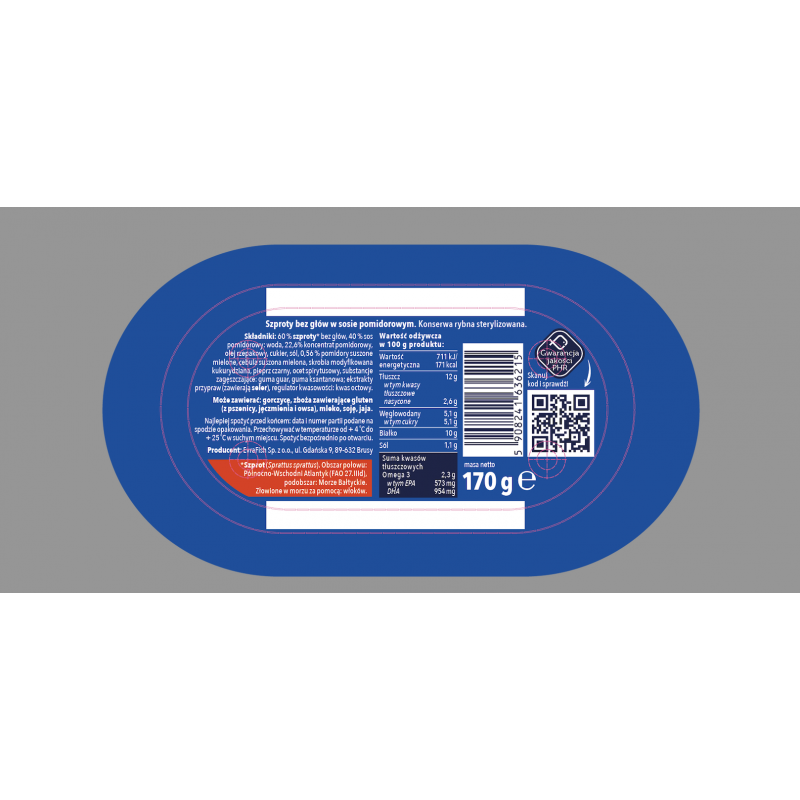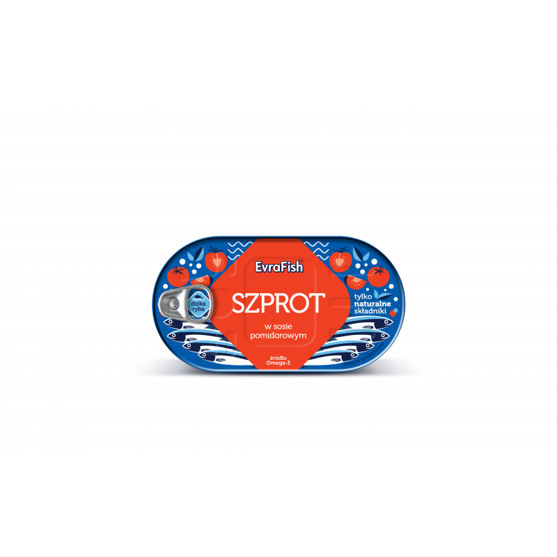 Składniki: Składniki: 60 % szproty* bez głów, 40 % sos pomidorowy: woda, 22,6% koncentrat pomidorowy, olej rzepakowy, cukier, sól, 0,56 % pomidory suszone mielone, cebula suszona mielona, skrobia modyfikowana, kukurydziana, pieprz czarny, ocet spirytusowy, substancje zagęszczające: guma guar, guma ksantanowa; ekstrakty przypraw (zawierają seler), regulator kwasowości: kwas octowy.