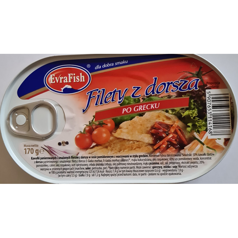Składniki: 50% kawałki filetów z dorsza panierowanego i smażonego: filety z dorsza (I-Gadus morhua callaris, II-Gadus morhua callaris)*, mąka kukurydziana, olej rzepakowy; 40% sos pomidorowy: woda, koncentrat pomidorowy, cukier, olej rzepakowy, ocet spirytusowy, cebula prażona (cebula, olej palmowy nieutwardzony, mąka pszenna, sól, przyprawy, ekstrakt pieprzu; 20% warzywa w zmiennych proporcjach (marchew, seler, pietruszka, por).