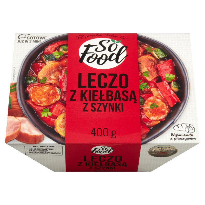 Leczo z kiełbasą z szynki wieprzowej. Produkt sterylizowany.