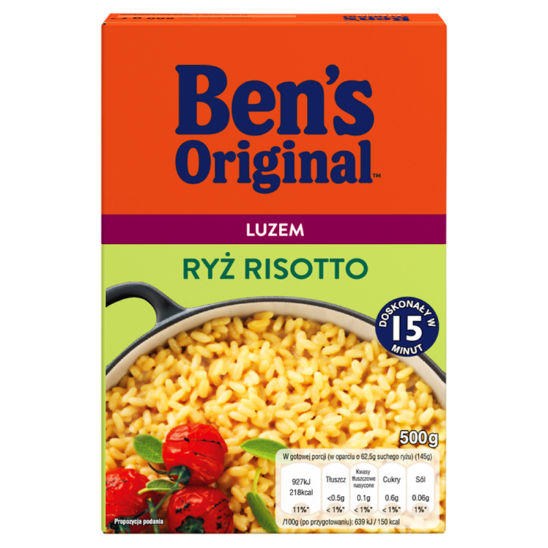 Podgrzewać na płycie grzejnej / palniku: Doskonały za każdym razem... 1. Rozpuść w rondlu 20 g masła. Dodaj 125 g ryżu i smaż go aż ziarenka będą przejrzyste. 2. Dodaj 300 ml gorącego bulionu i zagotuj. Gotuj na małym ogniu pod przykryciem regularnie mieszając, aż ryż nabierze kremowej konsystencji i wchłonie całą wodę (około 12 do 15 minut). 3. Dodaj do smaku masło i parmesan. Wymieszaj. Przełóż do naczynia. Smacznego! Od temperatury otoczenia