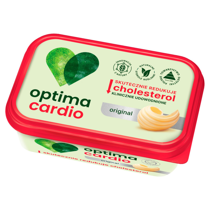 Klinicznie udowodniono, że sterole roślinne obecne w Optimie Cardio obniżają poziom cholesterolu we krwi. Wysoki poziom cholesterolu jest czynnikiem ryzyka rozwoju choroby wieńcowej serca. 30 g to dzienna zalecana porcja Optima Cardio zawierająca dawkę steroli roślinnych 1,6 g. Efekt obniżenia poziomu cholesterolu o 7-10 % uzyskuje się w ciągu 2-3 tygodni przy konsumpcji od 1,5 do 2,4 g steroli roślinnych dziennie, czyli 2-4 kromek pieczywa posmarowanego margaryną Optima Cardio. Produkt do smarowania pieczywa.