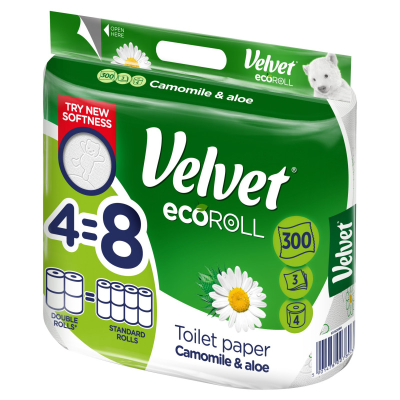 *Długość 4 rolek Velvet Big Roll odpowiada 8 standardowym rolkom papieru Velvet Rumianek i Aloes. Wszystkie dane odnoszą się do porównania papieru Velvet Big Roll do standardowego papieru Velvet Rumianek i Aloes 8 rolek.
