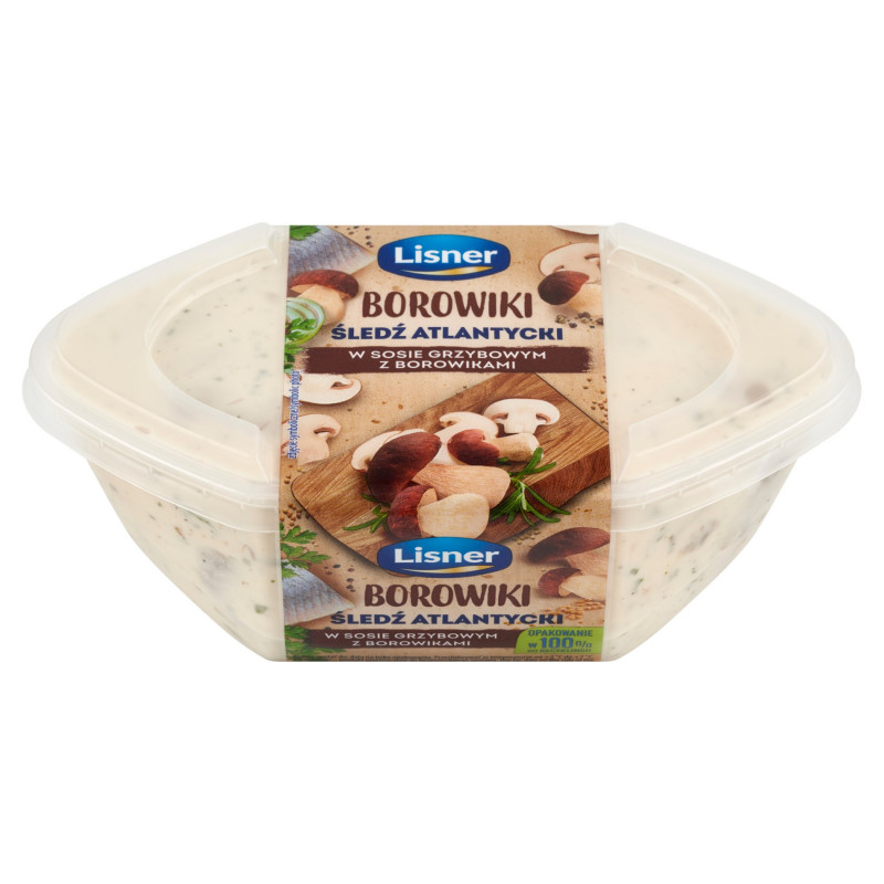 Marynowane, krojone filety śledziowe bez skóry w sosie grzybowym z borowikami.