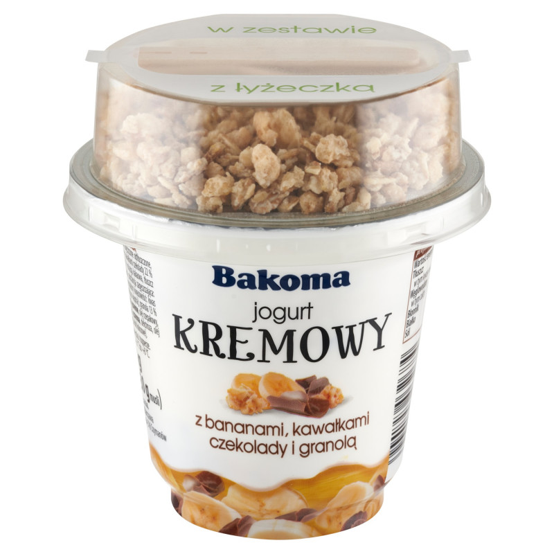 Jogurt kremowy z bananami i kawałkami czekolady oraz musli typ granola.