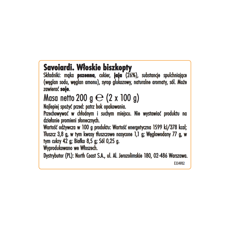 Składniki: mąka pszenna, cukier, jaja (26%), substancje spulchniające (węglany sodu, węglany amonu), syrop glukozowy, naturalne aromaty, sól. Może zawierać mleko, soję.