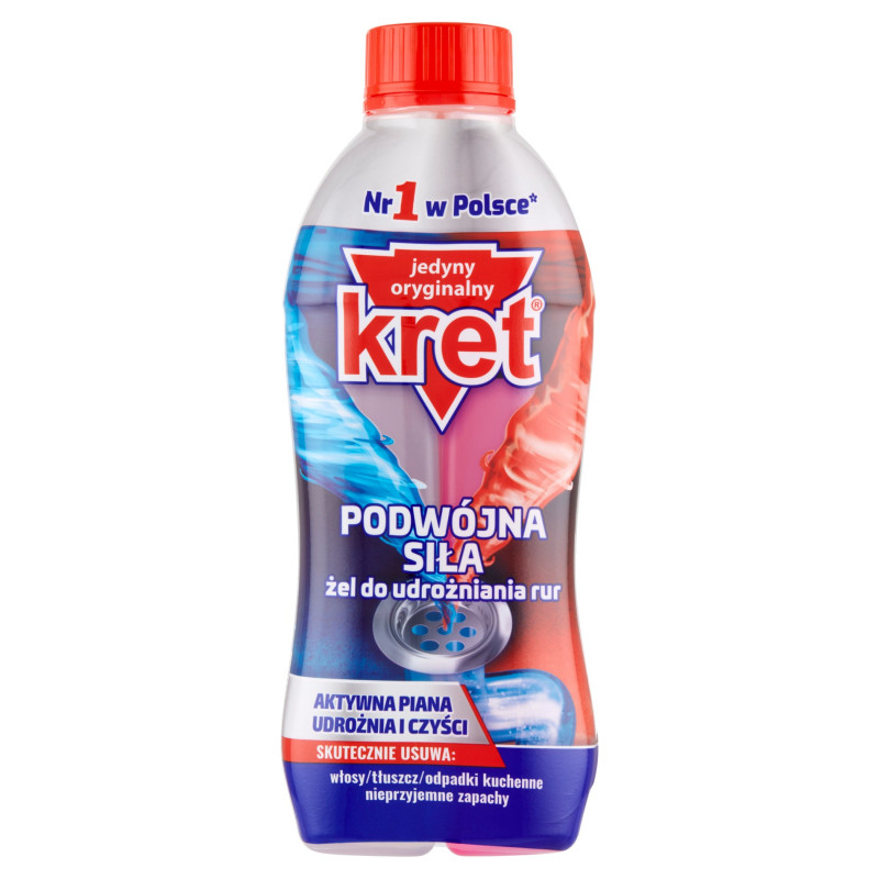 Dwuskładnikowy żel do udrożniania Kret podwójna siła to system głęboko oczyszczający zarówno syfony odpływów, jak i ścianki rur.