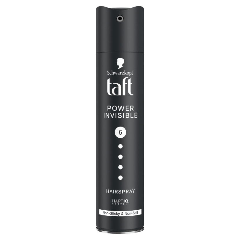 Innowacyjna formuła Schwarzkopf Taft Power Invisible nie powoduje efektu sklejonych, ciężkich i usztywnionych włosów. Zapewnia długotrwałe utrwalenie, a jednocześnie łatwo się wyczesuje. Pomaga chronić włosy przed uczuciem suchości i zapewnia mocne utrwalenie stylizacji nawet w trudnych warunkach pogodowych, takich jak wilgoć i wiatr. Lakier do włosów Schwarzkopf Taft posiada innowacyjny system HAPTIQ, który tworzy mikrowiązania i wzmacnia strukturę włosa.
