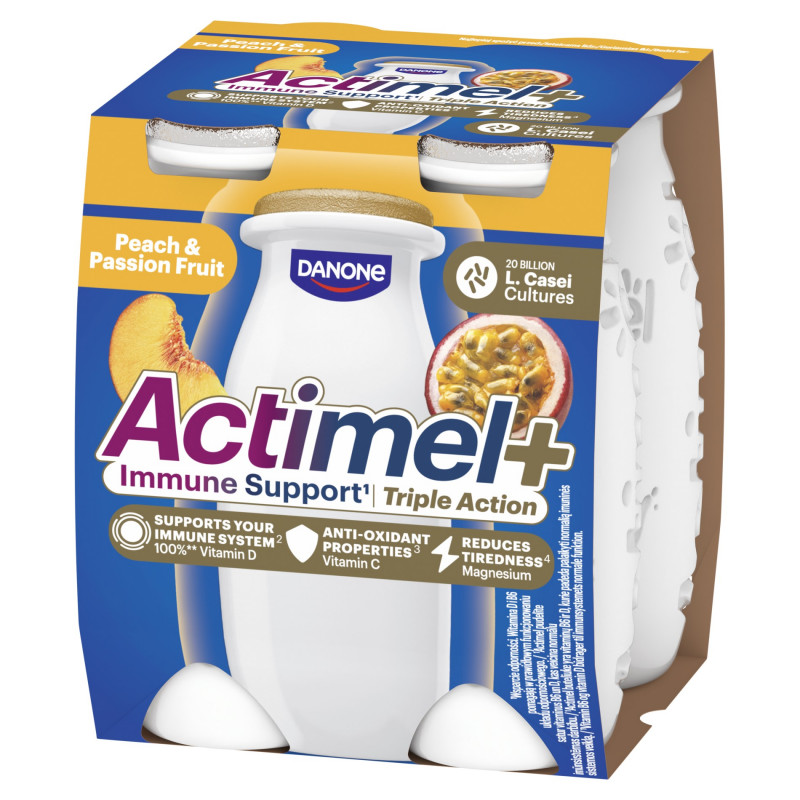 Actimel+ Triple Action o smaku brzoskwini i marakui to nowy wariant napoju jogurtowego Actimel - teraz wzbogaconego o jeszcze większą ilość witaminy D, a także zawierającego dodatek magnezu i witaminy C. Wszystko z myślą o tym, aby wesprzeć prawidłowe funkcjonowanie organizmu. Magnez przyczynia się do zmniejszenia uczucia zmęczenia i znużenia, witamina C pomaga chronić komórki przed stresem oksydacyjnym, a zawartość wit. D pomaga w prawidłowym funkcjonowaniu układu odpornościowego i w utrzymaniu zdrowych kości. Włącz nowy wariant Actimela do zbilansowanej, zróżnicowanej diety i ciesz się pysznym napojem jogurtowym z miliardami kultur bakterii L. casei Danone!